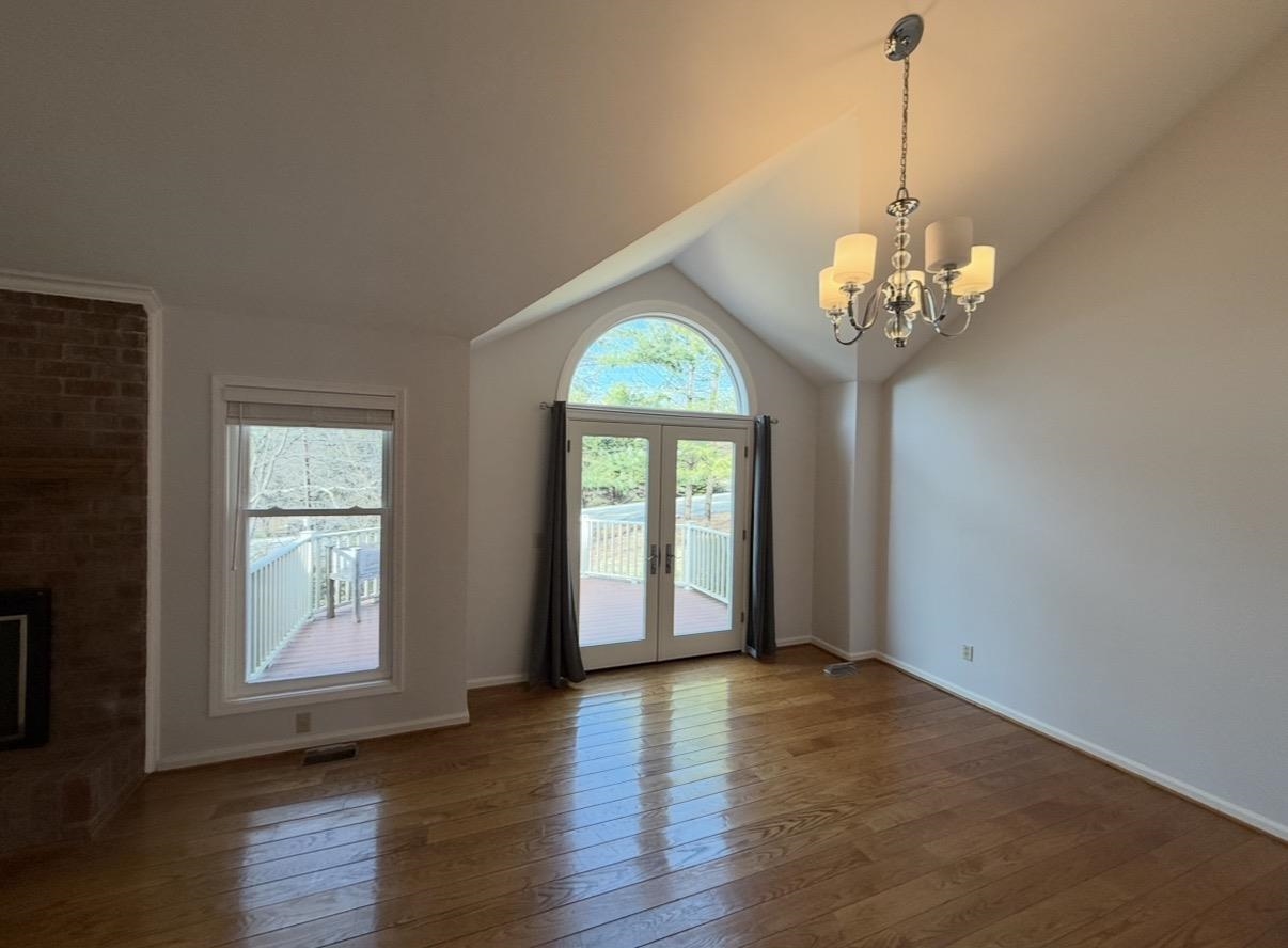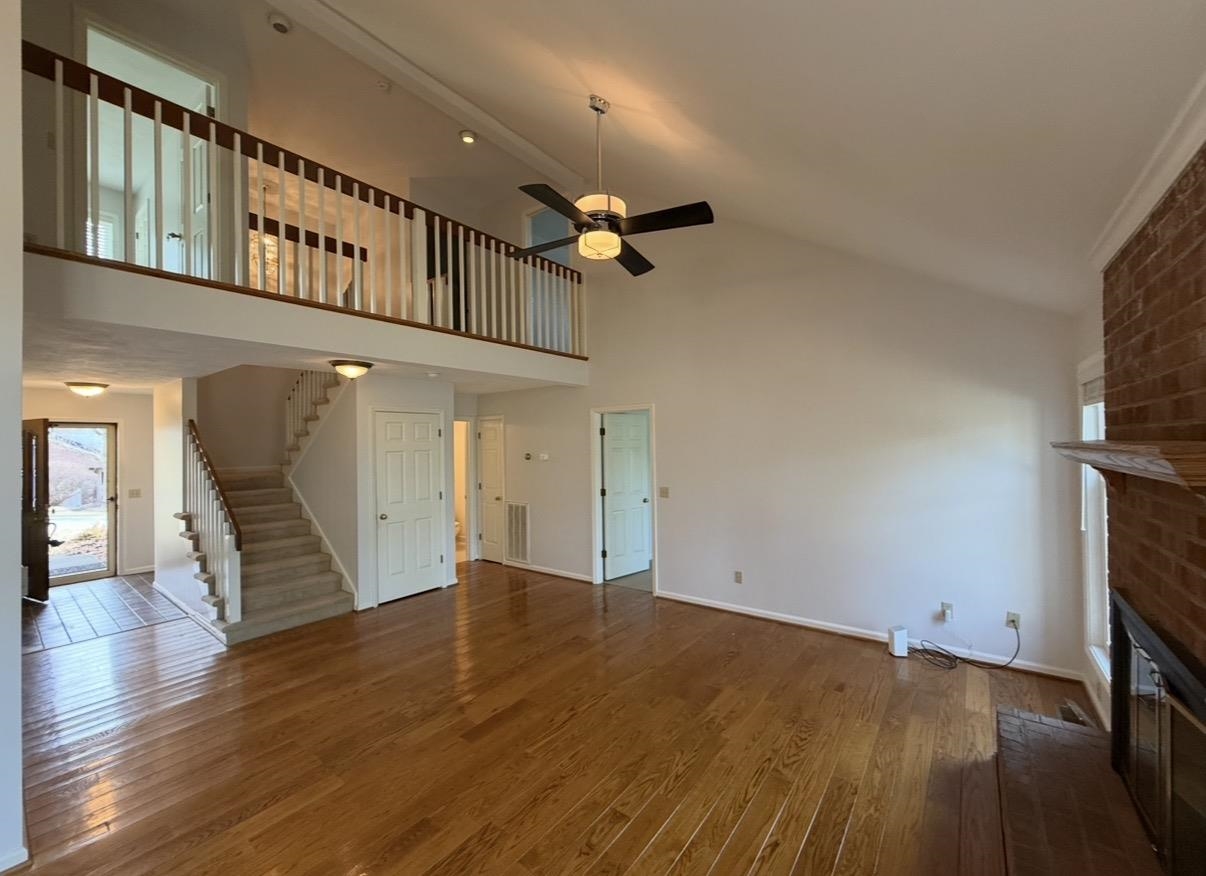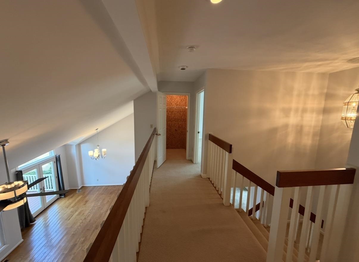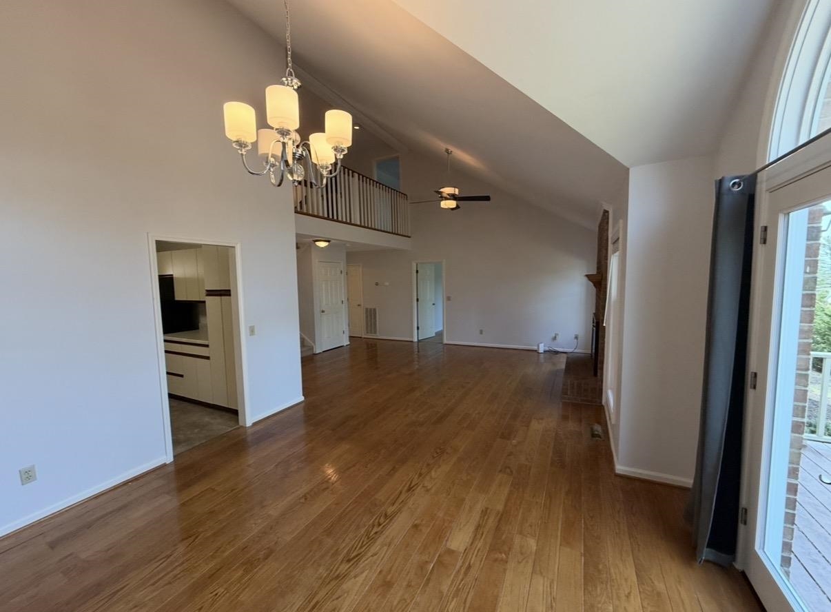 Spacious Living & Dining Rooms with hardwood floors & vaulted ceilings. Large Master Bedroom on Main level with en suite bathroom (separate tub & shower). French doors in Dining Room open out to back deck. Two big bedrooms upstairs with walk-in closets & walk-in access to additional storage in attic.